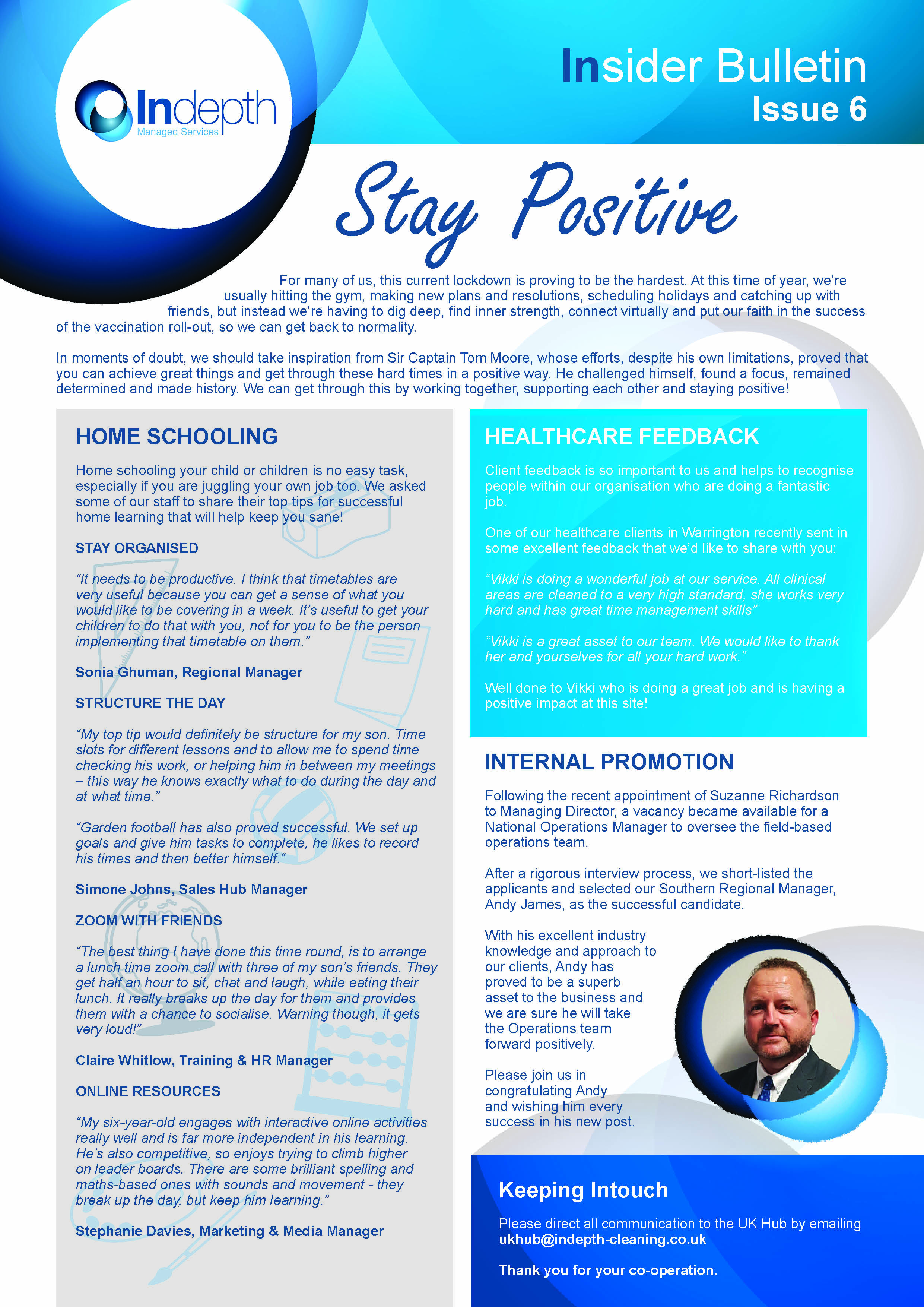 Our 6th Insider Bulletin includes news about an internal promotion at Indepth, some home schooling top tips and excellent healthcare client feedback.